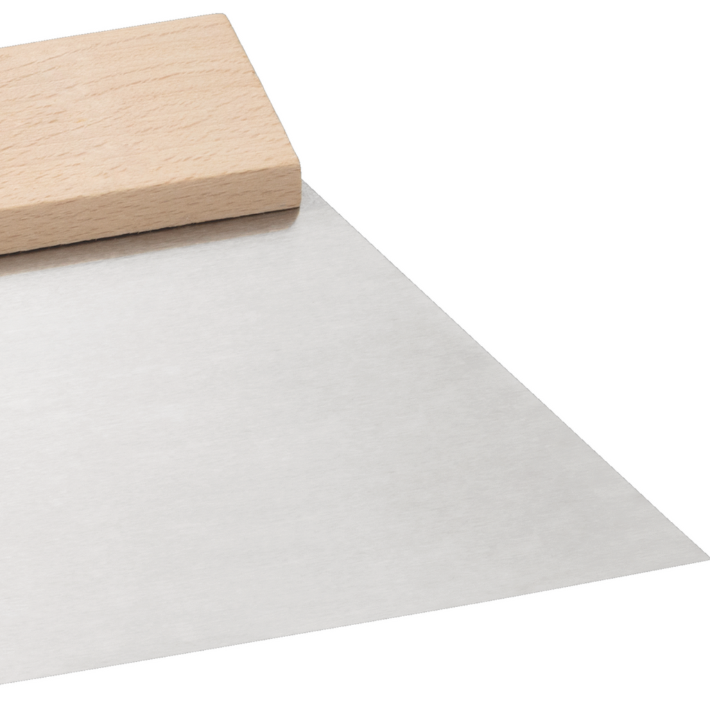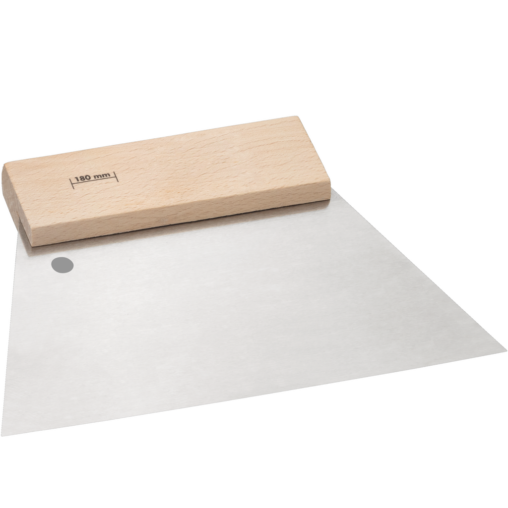 Flexibler Trapezspachtel 180 mm mit Stahlblatt und stabilem Holzgriff für sauberes Glätten und Spachteln.