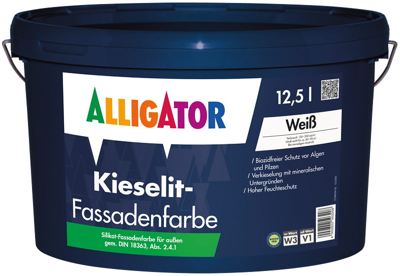 Alligator Kieselit-Fassadenfarbe ist eine Dispersions-Silikatfarbe gem. DIN 18363 Abs. 2.4.1, die ohne Biozide als Filmschutz funktioniert. Sie ist für Außenanstriche mit erhöhtem Feuchteschutz gedacht. Durch Alkalität und Edelkreidung schützt sie zudem vor Algen- und Pilzbefall.