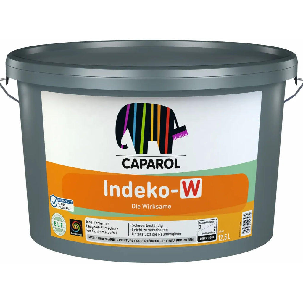 CAPAROL® Indeko-W ist in der Farbe Weiß erhältlich.Mit max. 5 % CaparolColor Abtönfarben oder AmphiColor® Voll- und Abtönfarben abtönbar. Bei Selbstabtönung benötigte Gesamtmenge untereinander vermischen, um Farbtonunterschiede zu vermeiden.