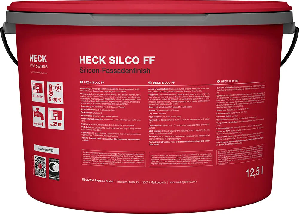 Heck Silco FF FILL ist eine Silicon-Füll-Fassadenfarbe nach VOB DIN 18 363 2.4.1 mit wasserabweisenden Eigenschaften. Es handelt sich um ein umweltfreundliches, offenporiges, füllendes Anstrichsystem, geeignet zum Ausgleichen von Strukturunterschieden und zum Verschlämmen von Haarrissen bis ca. 0,3 mm Rissbreite.
