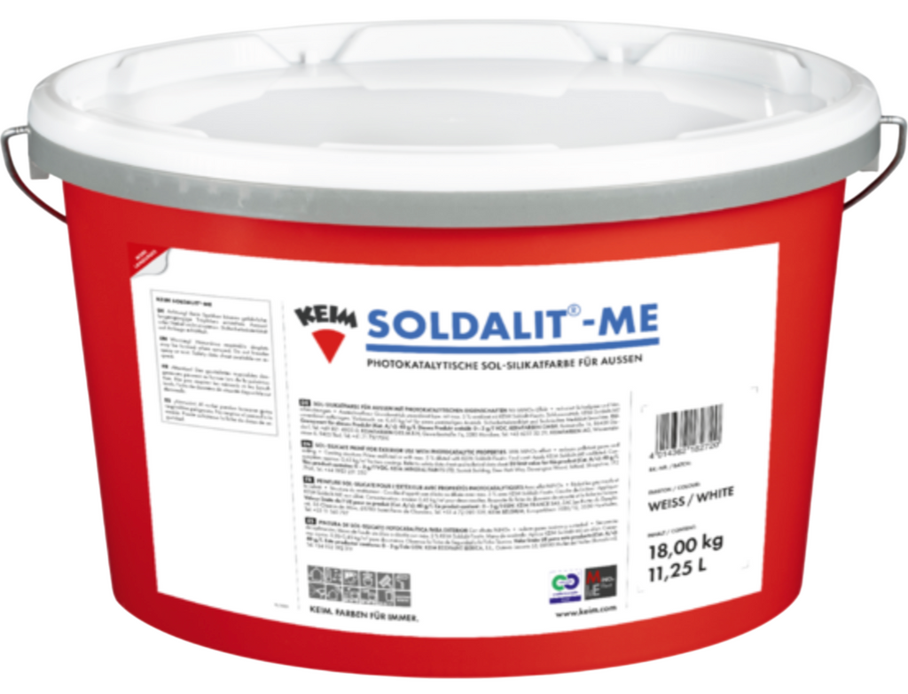 KEIM® Soldalit-ME ist eine hochspezialisierte Sol-Silikat-Fassadenfarbe auf Basis einer bewährten Bindemittelkombination von Kieselsol und Wasserglas mit photokatalytischer Wirkung. Diese Bindemittelkombination ermöglicht silikatische Anstriche nicht nur auf mineralischen, sondern auch auf einer Vielzahl organischer Untergründe – direkt und ohne zusätzliche Haftbrücken. Die photokatalytische Wirkung reduziert Schadgase (z.B. NOx, VOC’s) und steigert die Selbstreinigungsfähigkeit. Gefüllt und pigmentiert mit witterungsbeständigen Füllstoffen und rein anorganischen Pigmenten verbindet KEIM® Soldalit-ME alle Vorteile der klassischen Dispersionssilikatfarbe mit der Untergrundvielfalt organisch gebundener Farbsysteme. KEIM® Soldalit-ME erfüllt auch die Anforderungen der DIN 18363 Abs. 2.4.1 ® „Dispersionssilikatfarbe“. KEIM® Soldalit-ME ist ausgezeichnet mit Cradle to Cradle Certified Silver und C2C Certified Material Health Certificate™ Gold.