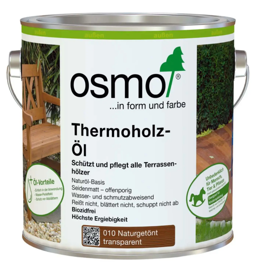 Osmo Terrassenöl ist ein transparenter, seidenmatter Holzanstrich auf Naturölbasis für jedes Holz im Außenbereich. Es ist offenporig, lässt das Holz atmen und vermindert Quellen und Schwinden. Das Terrassenöl ist wasserabweisend, äußerst wetter- und UV-beständig und reißt nicht, blättert nicht, schuppt nicht ab. Es wird empfohlen ohne Abschleifen einfach zu überstreichen - eine Grundierung ist nicht notwendig. Das Öl ist leicht und ansatzfrei verstreichbar und trocknet beim Streichvorgang nicht an. Der getrocknete Anstrich ist unbedenklich für Mensch, Tier und Pflanze (speichel- und schweißecht lt. DIN 53160, geeignet für Kinderspielzeug lt. EN 71.3).