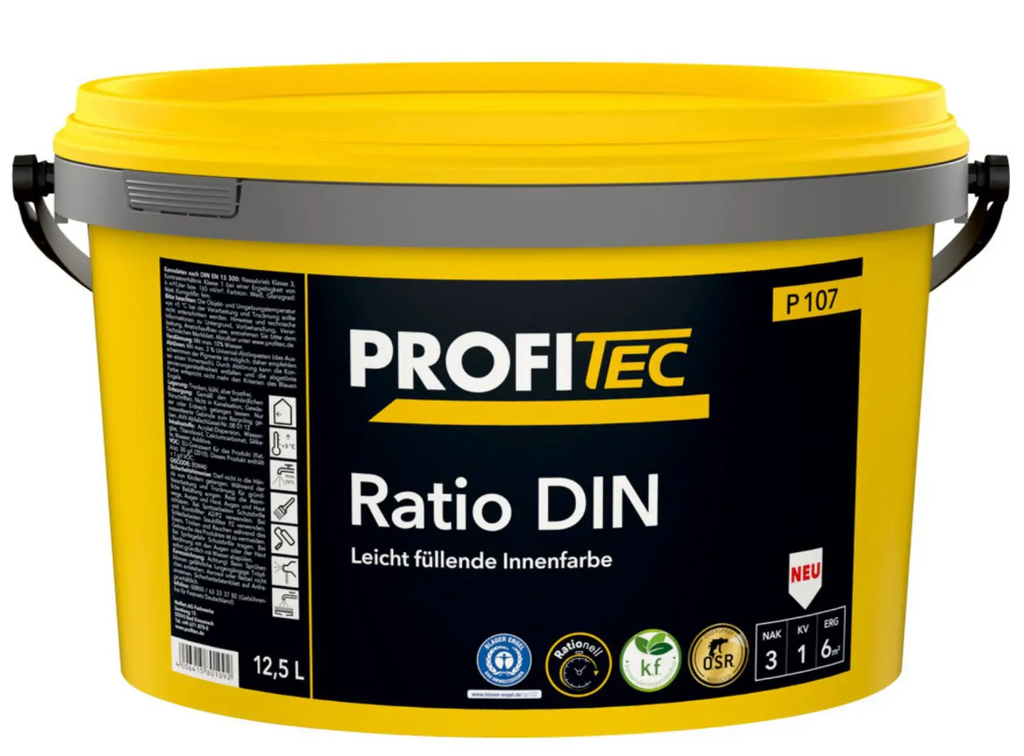 PROFITEC Ratio DIN P107 ist eine rationelle Innenfarbe für Renovierungs- und Neuanstriche im gesamten Wohn- und Arbeitsbereich mit einfacher Beanspruchung. Die Farbe ist leicht füllend für stumpfmatte Wand- und Deckenbeschichtungen speziell im Objektbereich.