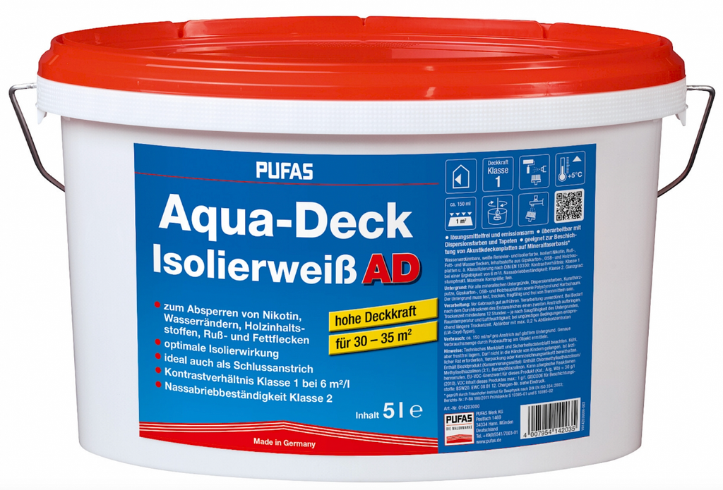 PUFAS Aqua-Deck Isolierweiß AD hat eine optimale Isolierwirkung und ist zum Absperren von Nikotin, Wasserrändern, Holzinhaltsstoffen, Ruß- und Fettflecken einsetzbar. Das Isolierweiß eignet sich auch perfekt für den Schlussanstrich und wird im Innenbereich verwendet.
